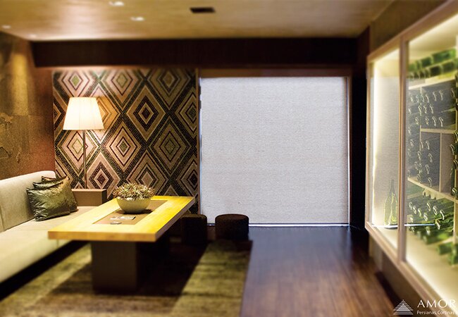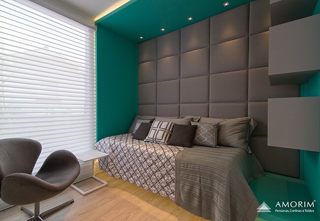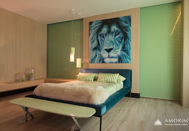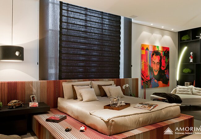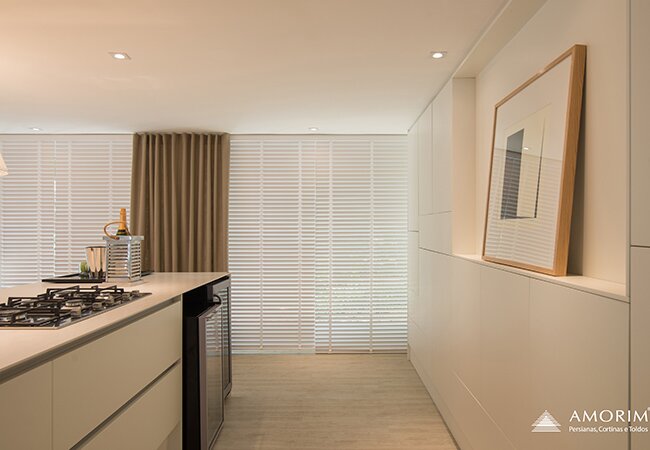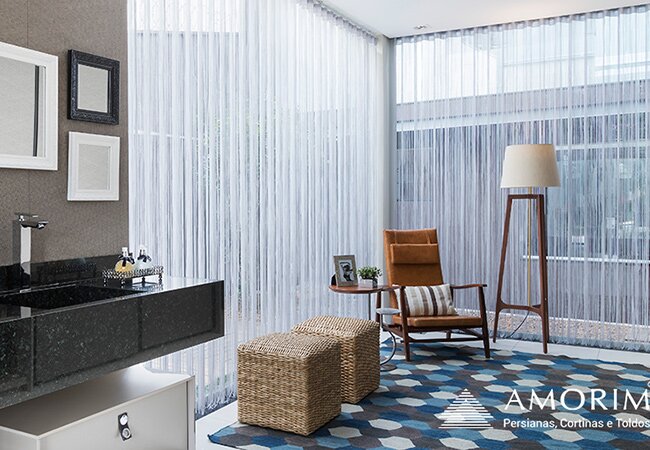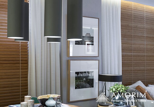 A Persiana Passione Amorim é produzida com uma combinação de tecido translúcido e opaco, com a vantagem da praticidade do acionamento de uma persiana e um resultado estético muito semelhante de uma cortina tradicional. Valoriza a luminosidade, um dos elementos que mais proporcionam bem-estar em um ambiente.