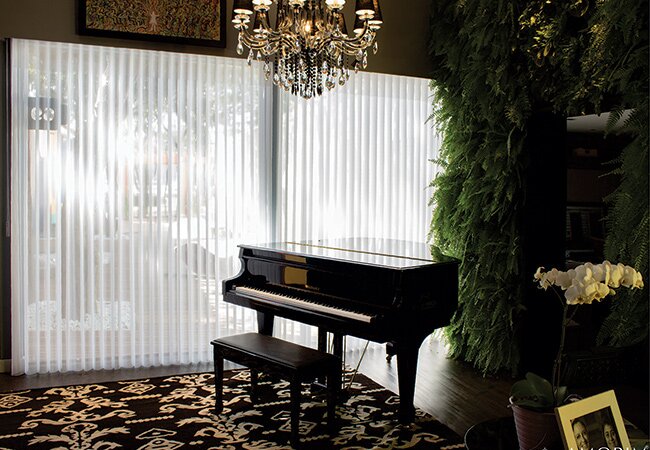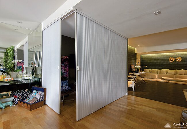 A Persiana Vert Gliss Amorim corre na posição horizontal sob um trilho superior. Indicada para separar ambientes e cria novos espaços.
